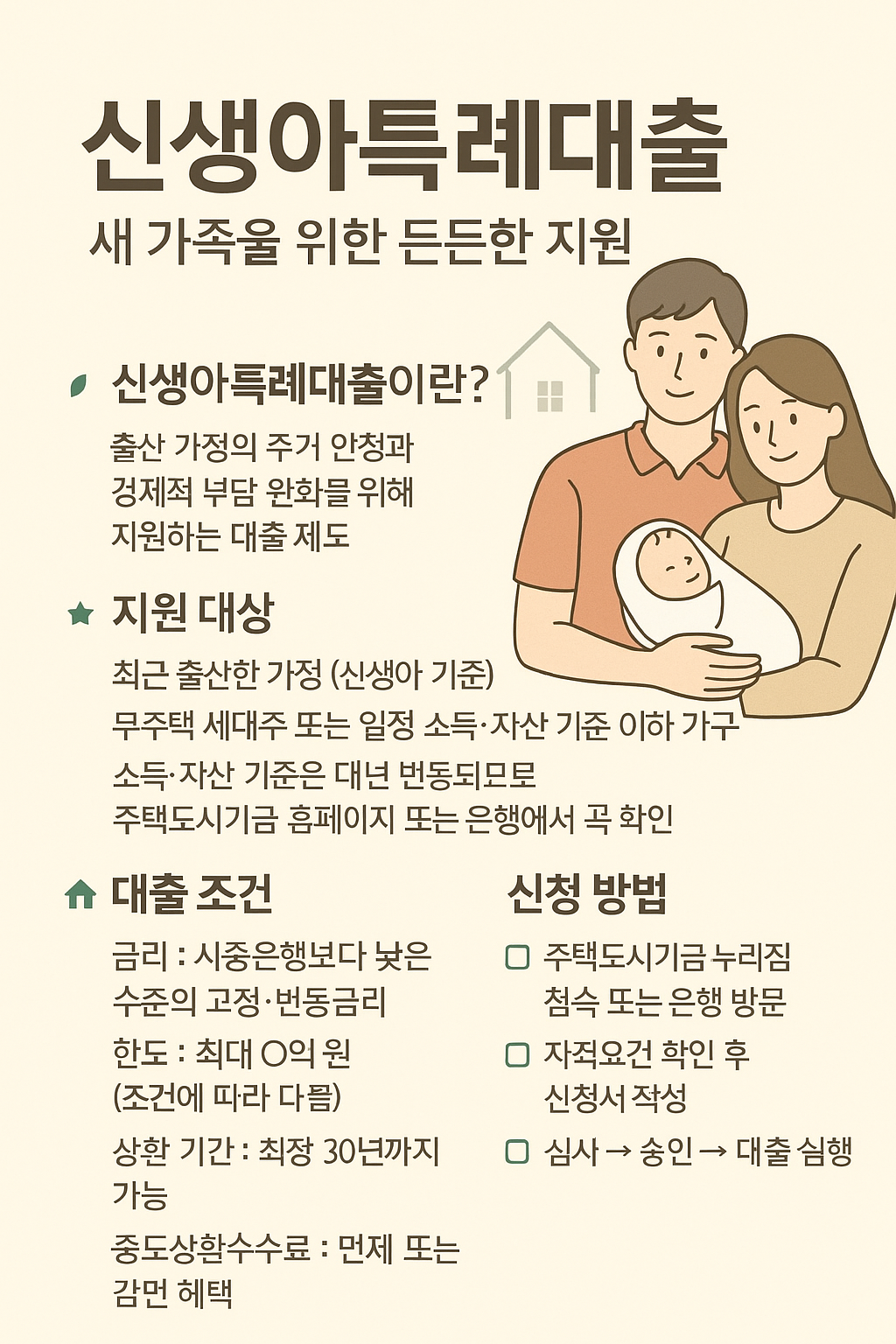 신생아특례대출은 출산 가정의 주거 안정과 경제적 부담 완화를 위해 제공되는 특별 대출 제도예요.
