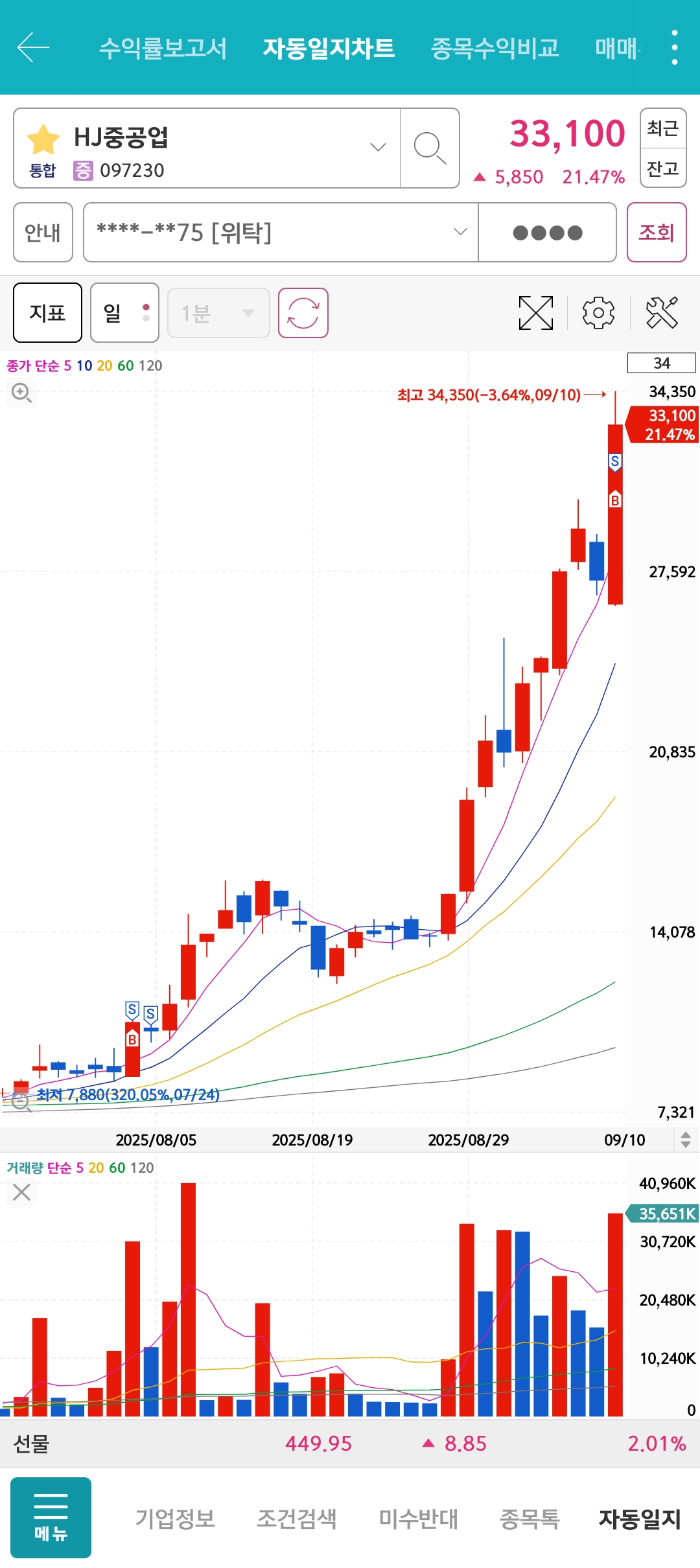 전날 양매수 이지는 않지만 컨테이너 수주 이슈 전날은 슈팅없다 오전에 돈들어오고 프로그램 매수 전고점 돌파로 매수 매도(수익보다는 방어)