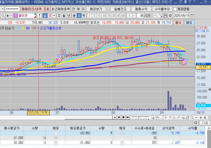 전날 대체에 매수 뉴스 임상1상매매라 외국인 수급도 있고 해서 매수 아침 또 올라가겠지 생각에 손절 늦게 함(내렸다고 올라올때 평단근처에 오면 매도 해야함) 힘이없어면 그리고 9월13일 뉴스보고 아침에 바로 매도 했어야 함..