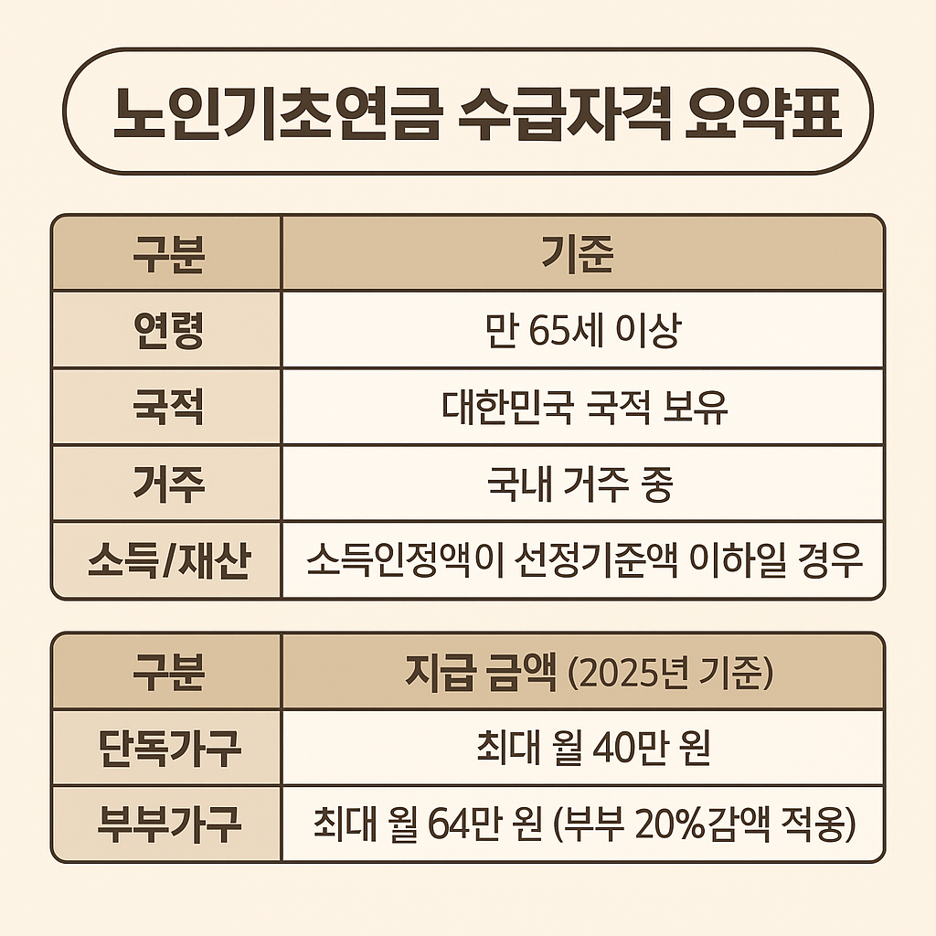 구분기준연령 만 65세 이상 국적 대한민국 국적 보유 거주 국내 거주 중 소득/재산 소득인정액이 선정기준액 이하일 경우 👉 2025년 선정기준액