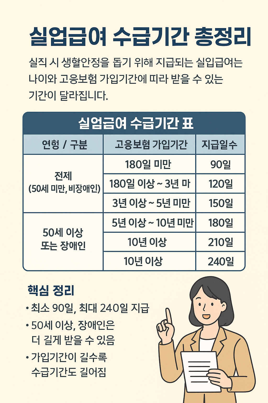 연령 / 구분고용보험 가입기간지급일수전체 (50세 미만, 비장애인) 180일 미만 90일 180일 이상 ~ 3년 미만 120일 3년 이상 ~ 5년 미만 150일 5년 이상 ~ 10년 미만 180일 10년 이상 210일 50세 이상 또는 장애인 1년 이상 ~ 3년 미만 150일 3년 이상 ~ 5년 미만 180일 5년 이상 ~ 10년 미만 210일 10년 이상 240일