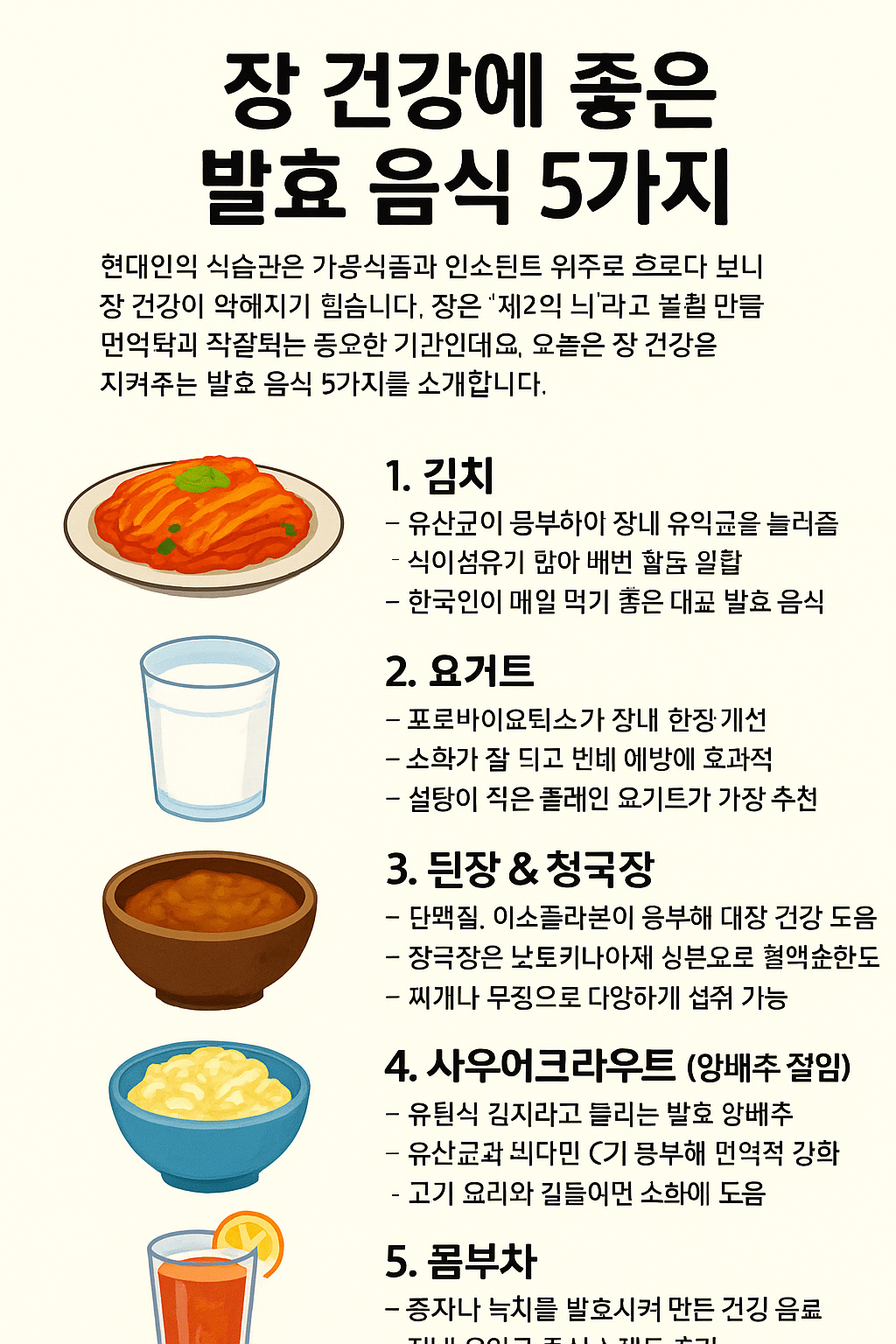 현대인의 식습관은 가공식품과 인스턴트 위주로 흐르다 보니 장 건강이 약해지기 쉽습니다. 장은 ‘제2의 뇌’라고 불릴 만큼 면역력과 직결되는 중요한 기관인데요. 오늘은 장 건강을 지켜주는 발효 음식 5가지를 소개합니다.