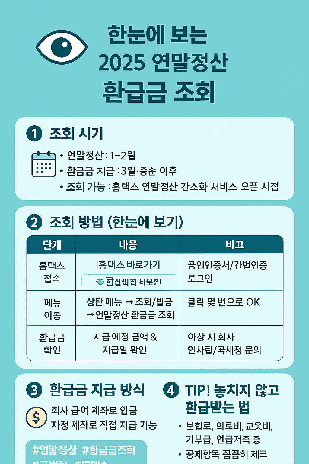 단계내용비고① 홈택스 접속 홈택스 바로가기 공인인증서/간편인증 로그인 ② 메뉴 이동 상단 메뉴 → 조회/발급 → 연말정산 환급금 조회 클릭 몇 번으로 OK ③ 환급금 확인 지급 예정 금액 & 지급일 확인 이상 시 회사 인사팀/국세청 문의