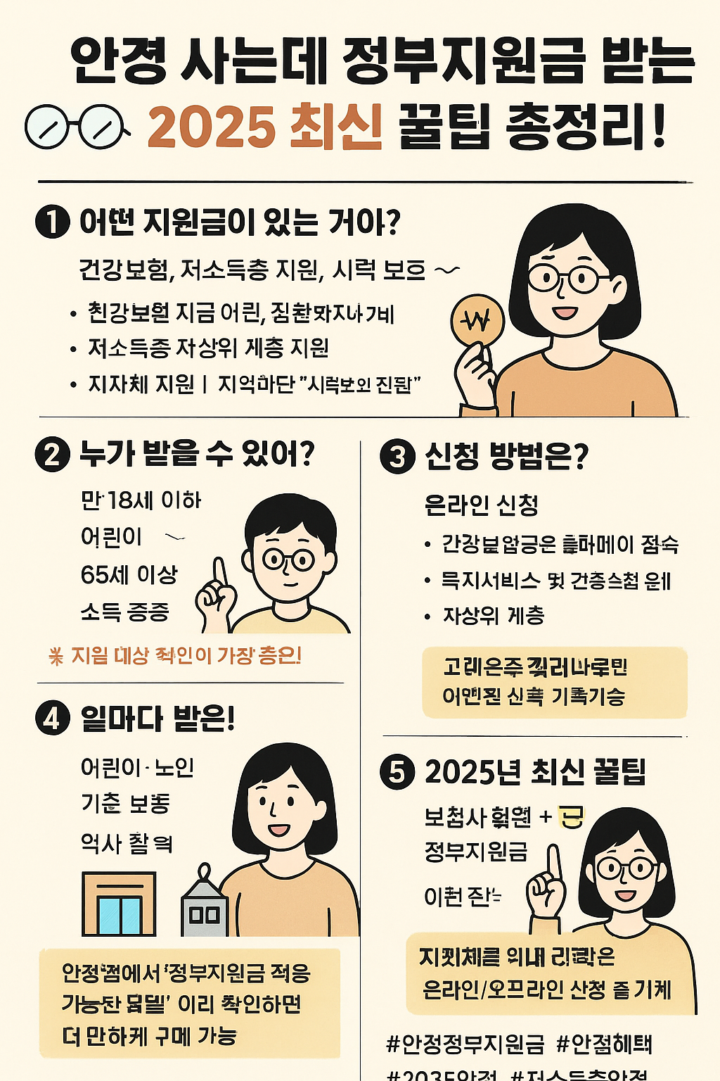 안경 쓰는 사람이라면 누구나 한 번쯤 고민하는 비용 문제! 그런데 알고 보면 정부에서 지원해주는 돈이 있다는 사실, 알고 계셨나요? 2025년 기준으로 달라진 최신 정보까지 한 번에 정리했어요