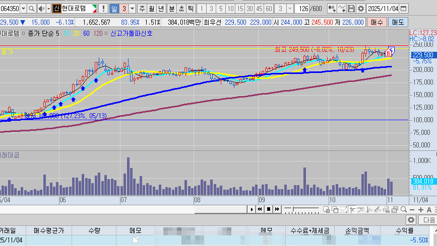 현대로템 전일양매수이고 일봉상 신고가 얼마남지 않았고 방산주 라 매수했는데 아침 보지 몬해서 너무늦게 매도 우크라라이나 전쟁 이슈가아니라 종전 쪽에 가까운 누스 나오면서 내려감..