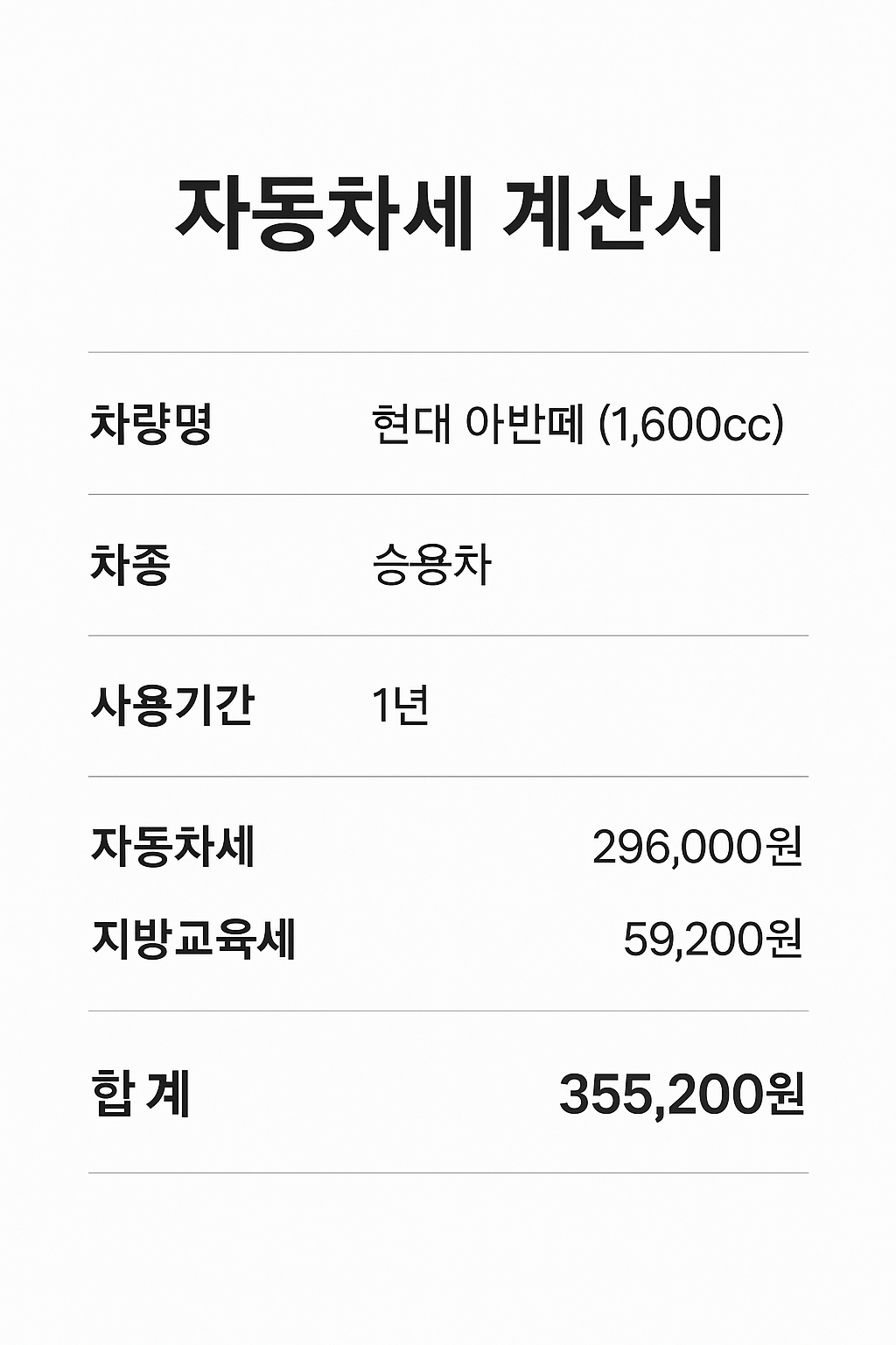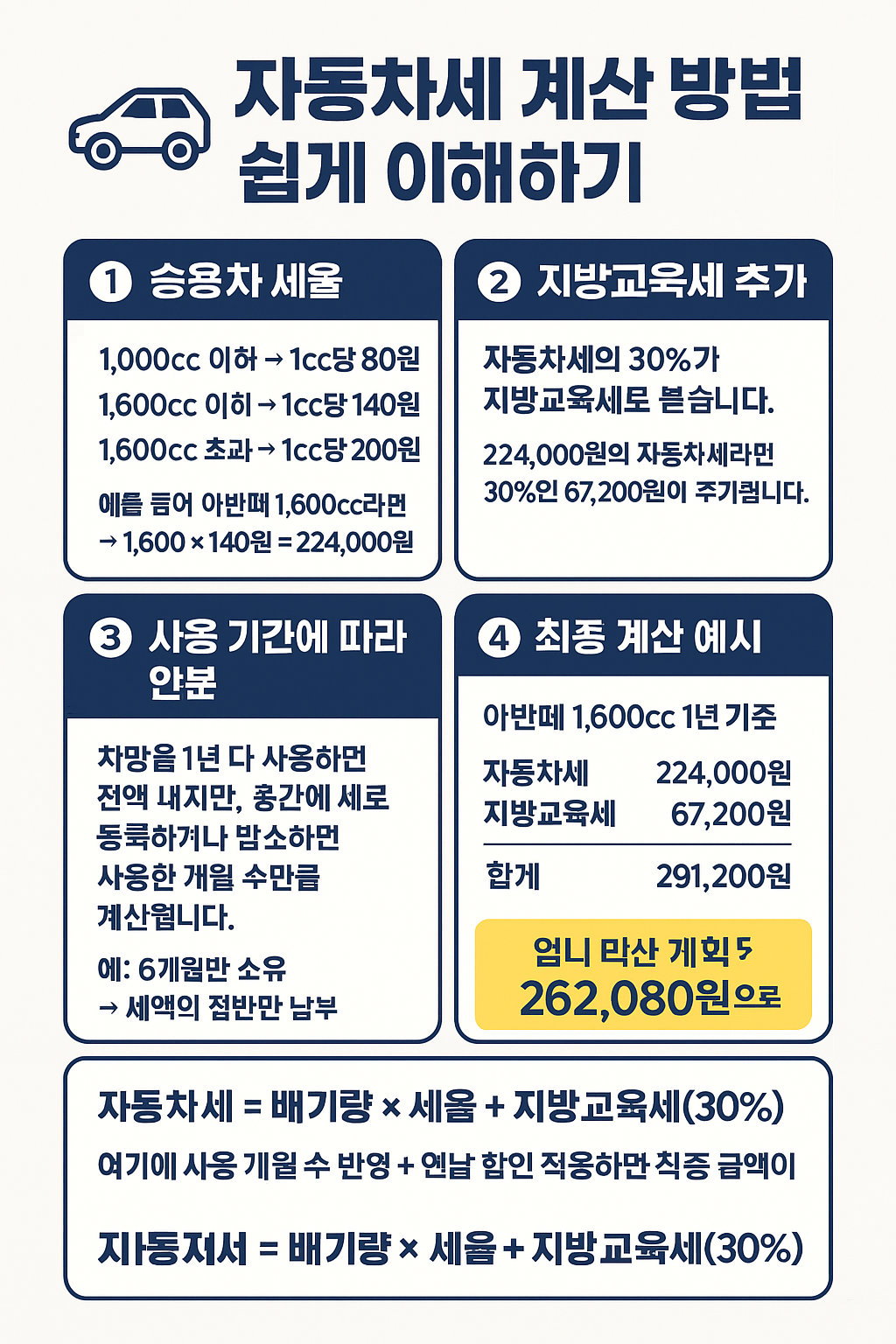 예를 들어 아반떼 1,600cc라면 → 1,600 × 140원 = 224,000원