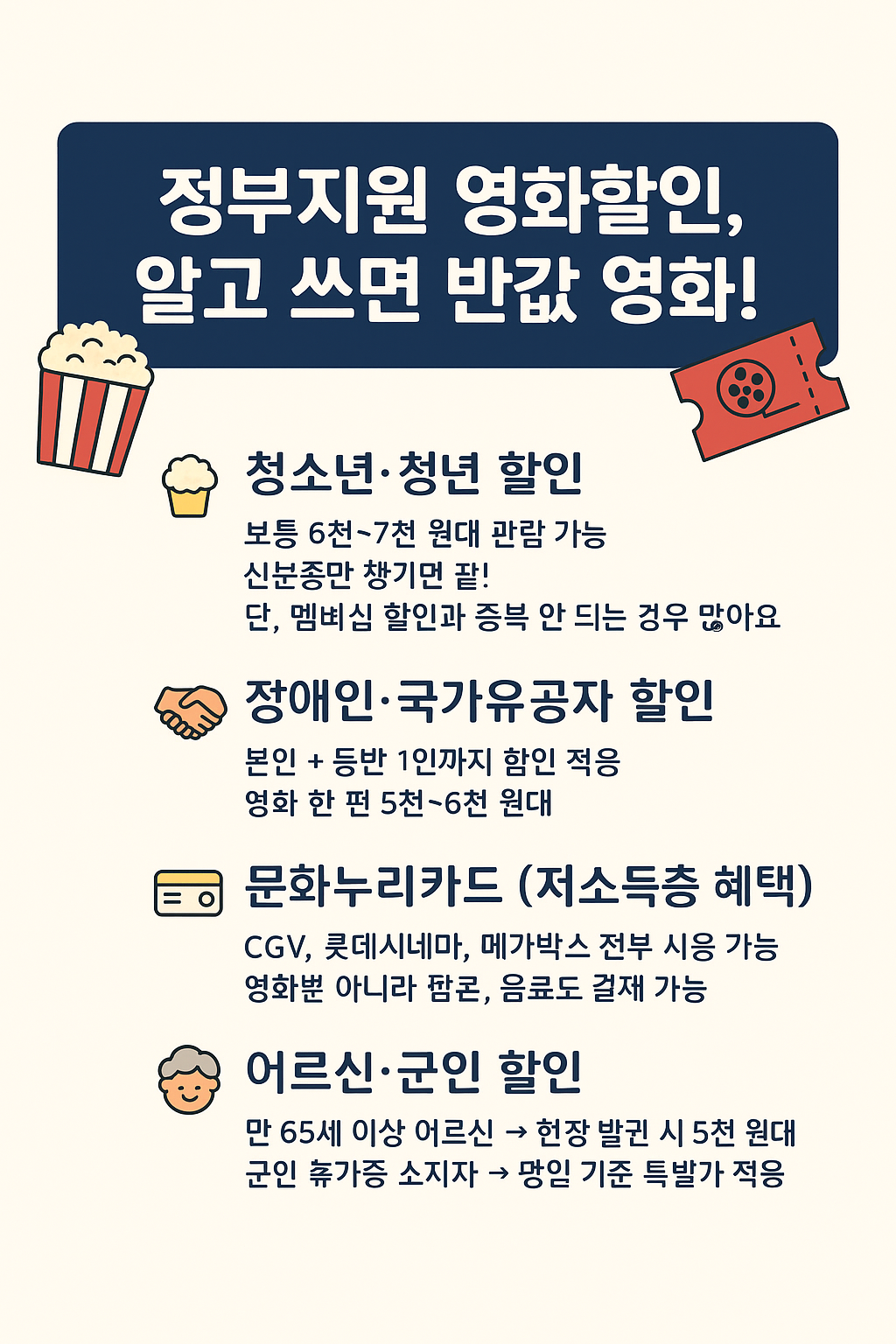 영화 한 편 보려면 티켓값이 부담될 때가 많죠. 특히 가족이나 연인과 함께라면 더 크게 느껴지는데요. 다행히도 정부에서 다양한 계층을 대상으로 영화관람료 할인 지원 제도를 운영하고 있어요. 오늘은 그 혜택들을 한눈에 정리해드릴게요.