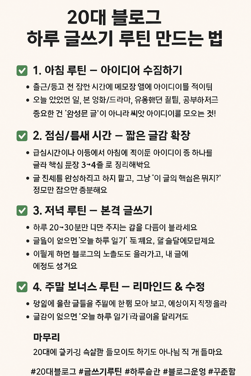 20대 블로그 하루 글쓰기 루틴 만드는 법 ✍️알뜰생활꿀팁 2025. 9. 1. 22:27반응형