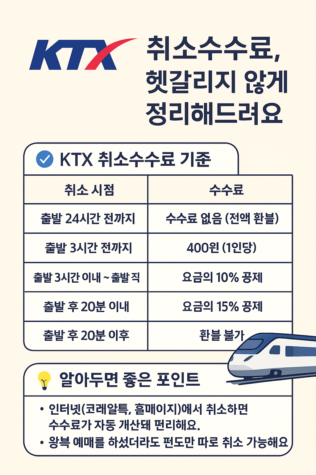 🚄 KTX 취소수수료, 꼭 알아두세요!알뜰생활꿀팁 2025. 9. 4. 18:34반응형KTX 취소수수료, 헷갈리지 않게 정리해드려요